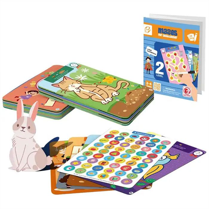 Освен това комплектът съдържа 54 стикера, които могат да се използват за награждаване на децата за успешно завършване на лабиринтите, насърчавайки ги да надграждат своите умения.