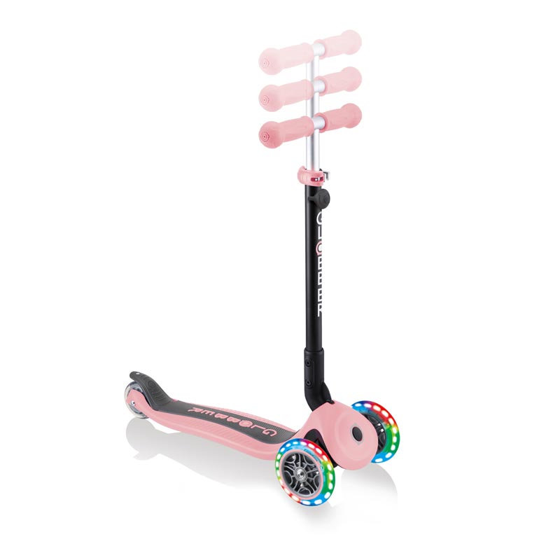 Пастелно розова триколка със седалка за деца от серията Go Up Foldable Plus Lights на Globber – всичко в едно продукт, който предоставя вълнуващи преживявания и функционалност за дълъг период от време. Триколката със седалка успява да съчетае в себе си 3 основни превозни средства за деца: